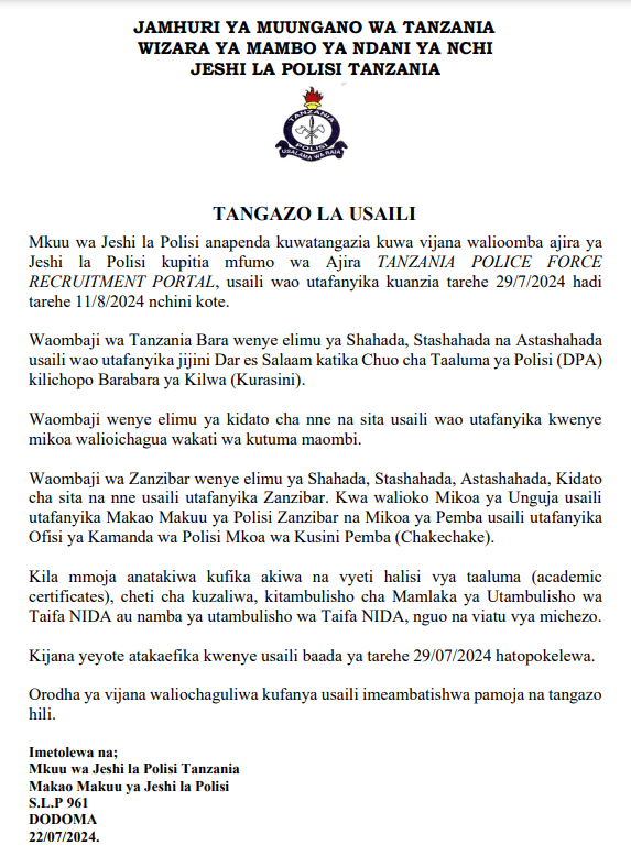 The Inspector General of Police would like to announce that the youth who applied for jobs in the Police Force through the TANZANIA POLICE FORCE RECRUITMENT PORTAL will have their interviews conducted from July 29, 2024, to August 11, 2024, nationwide.