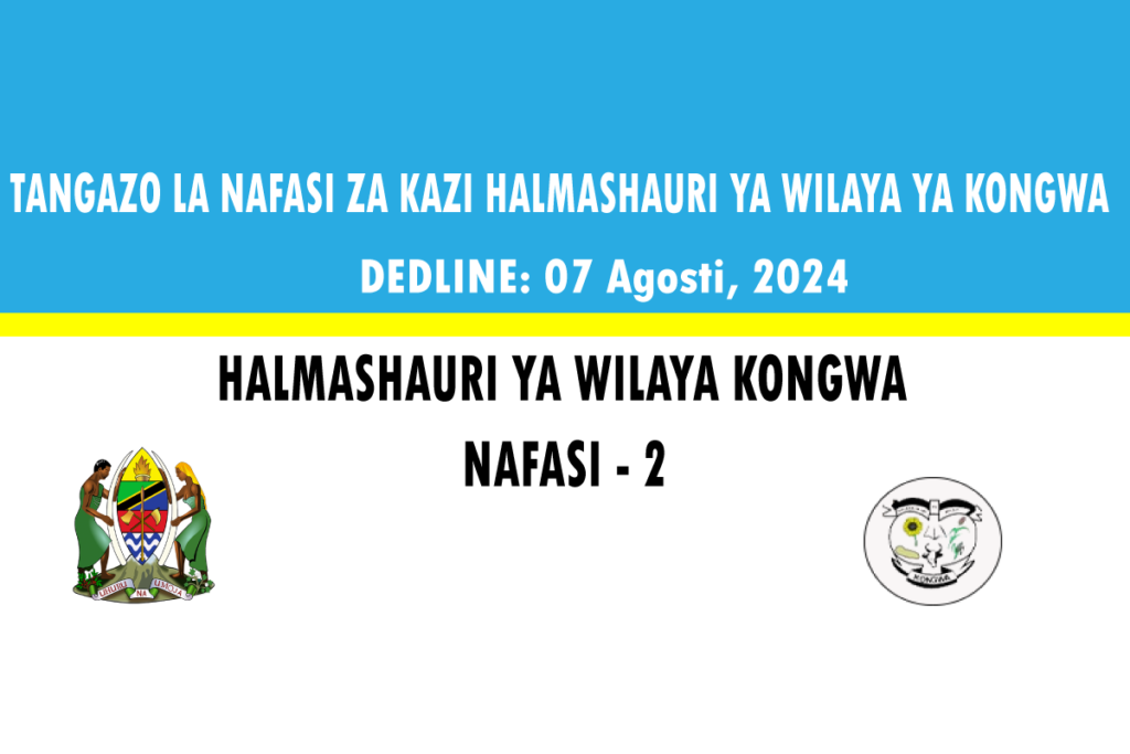 The Executive Director of the Kongwa District Council, following the receipt of a new employment permit with Ref. No. FA.97/288/01/09 dated June 25, 2024, from the Secretary General, Office of the President, Public Service Management and Good Governance, announces to all Tanzanians who meet the qualifications and are interested in working at the Kongwa District Council to submit applications to fill the job position as follows;